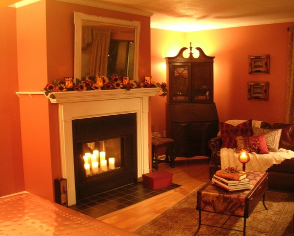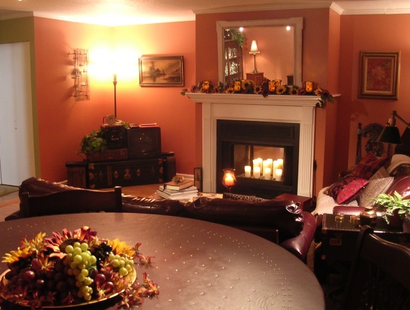 This is a close up of my husbands leather and brass work. (He also does period costume leather and binds antique books.) The autumn accessories were from our wedding a couple years ago. I pull them out and decorate for our anniversary each October. If I kept them out all year they wouldn’t be as special. Once a year it’s fun to relive the memories and recombined them in a new way. The box in front of the fireplace is filled with keepsakes we’ll go through on our anniversary.
