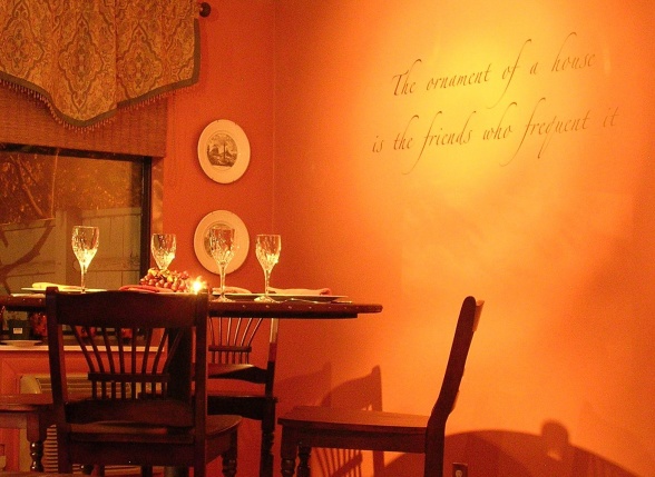 This is the quote we placed over the pub table. There is a lot going on in this relatively small space. I didn’t want to compete with the art over the buffet, so I chose metallic lettering that would be more subtle and give the eye a place to rest. I want our guests to take the focus when we sit down to dinner!