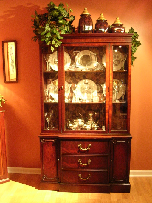 Grandma’s china cabinet. I added fabric to the back of the cabinet as a backdrop for my china and to keep it from looking like a cave.